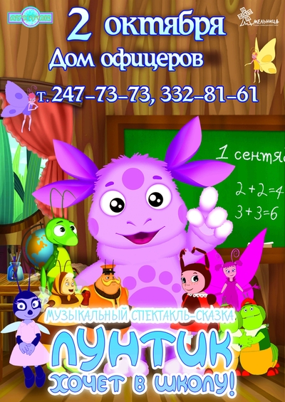 2 октября в Доме офицеров пройдет музыкальный спектакль-сказка об очередных приключениях добродушного и любознательного Лунтика.                       Где: г. Самара, ул. Шостаковича, 7, Окружной Дом Офицеров (ОДО) Когда: 2 октября (ВС) в 11:00 и 13:30 Стоимость билетов: 200 – 700 руб. Контакты: 247-73-73, 332-81-61 О мультипликационном сериале «Приключения Лунтика» не слышал только ленивый. Этот маленький инопланетянин, свалившийся к нам на Землю с Луны, покорил сердца не только миллионов детей нашей страны, но и их родителей. Все дело в том, что «Лунтик»  не просто мультфильм о фиолетовом пушистом существе. Каждая серия «Лунтика» - это новые знания, это сложные вещи, рассказанные простым языком, это знакомство с окружающим миром и сложными взаимоотношениями его обитателей. Лунтик легко, понятно и, главное, интересно рассказывает как различать добро и зло, как правильно себя вести, и что действительно нужно ценить. Спектакль «Лунтик хочет в школу» является достойным продолжением поучительных историй известного героя. Детей ждут яркие костюмы, декорации и увлекательные игры.