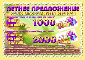 Внося на игровую карту развлекательного центра "ЛИМБО" сумму от 1000 рублей Вы получаете одарок в размере внесенной суммы. Для участия акции необходимо заполнить анкету на рецепции "ЛИМБО".