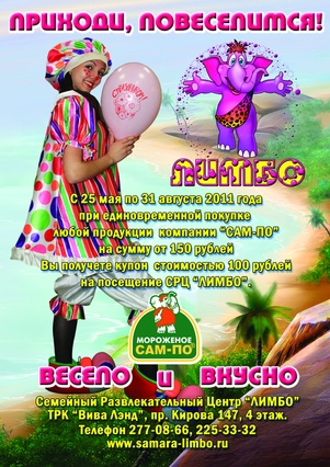 При единовременной покупке любой продукции компании "САМ-ПО" на сумму от 150 рублей Вы получаете купон стоимостью 100 рублей на посещение СРЦ "ЛИМБО".