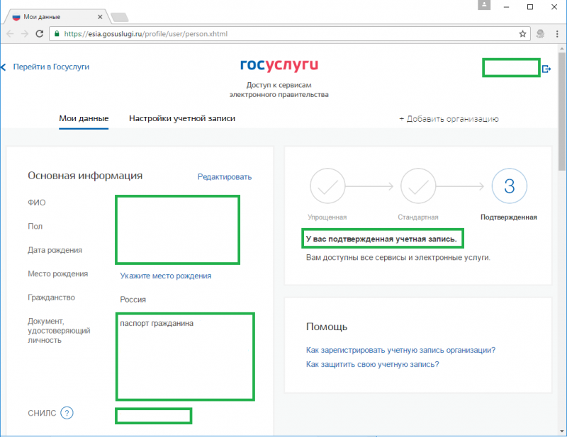Вам нужно зайти в личный кабинет на сайте ГосУслуги и посмотреть статус записи. Должно быть написано «Подтвержденная учетная запись». Дополнительно убедитесь, что все поля, выделенные зеленой рамкой на картинке, заполнены. Если это так, вы можете смело использовать свою ЕСИА для подачи заявления в первый класс. В противном случае стоит сходить в центр ГосУслуг, и там помогут привести вашу учетку ЕСИА в нужный вид. Качество вашей учетной записи можно проверить самостоятельно еще быстрее - попробуйте зайти на сайт Федеральной Налоговой Службы по адресу lkfl.nalog.ru. Полностью подтвержденная запись позволит вам попасть в личный кабинет сразу, а если есть проблемы вы увидите сообщение об ошибке.