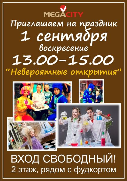 ТРЦ Мега-Сити ТРЦ «МегаСити» приглашает всех на праздник ко Дню Знаний 1 сентября с 13.00 до 15.00. Детей и их родителей ждут Невероятные открытия с персонажами Нолик и Симка. Так зовут маленьких человечков, которые живут в машинах, приборах и других вещах, созданных человеком. Они отлично разбираются в технике и дают много полезных советов. Поэтому фиксики готовы вместе с ребятами собрать все элементы одного из познавательных и увлекательных праздников как «День знаний». А также всех удивит интерактивное научное шоу -"ОТКРЫВАШКА" - настоящий сюрприз и открытие ждут ребят. Головокружительные и фантастические научные опыты в передвижной лаборатории, которые удивят даже взрослых! Веселый профессор откроет мир науки для всех ребят. Всех ждет знакомство с сухим льдом, каша из мыльных пузырей, сумасшедшие прически, супердымовуха и многое другое. И конечно же, бесплатный аквагрим и воздушные шары! 2 этаж ТРЦ «МегаСити», рядом с фудкортом с 13.00 до 15.00! Вход бесплатный.