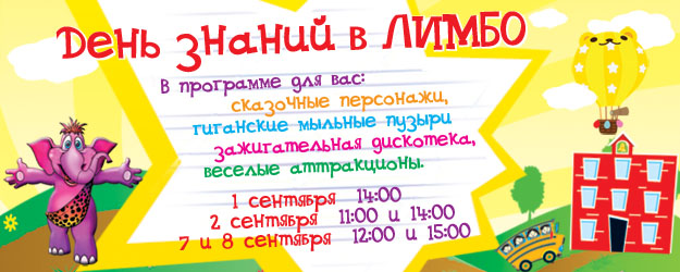 СРЦ Лимбо Приближается новый учебный год! Впереди долгожданная встреча со школьными друзьями, новые события, новые открытия. Встречайте новый учебный год вместе с ЛИМБО! Приглашаем на праздничную программу ДЕНЬ ЗНАНИЙ! Вас ждут: - интерактивное игровое шоу со сказочными персонажами, - шоу гиганских мыльных пузырей, - зажигательная дискотека, - любимые аттракционы и видеоигры, а также море веселья, улыбок и позитива! Не пропустите! Начало мероприятий: 1 сентября - 14.00 2 сентября - 11.00, 14.00 7, 8 сентября - 12.00, 15.00