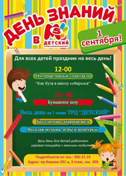 ТРЦ «Детский» Приглашаем вас на 1 сентября в ТРЦ "ДЕТСКИЙ"! Для всех маленьких гостей сладкая вата в подарок! Для вас увлекательный интерактивный спектакль в 12-00 и яркое Бумажное шоу в 16.00. Весь день веселая музыка, игры и конкурсы! Приходите, мы будет очень рады Вас видеть!