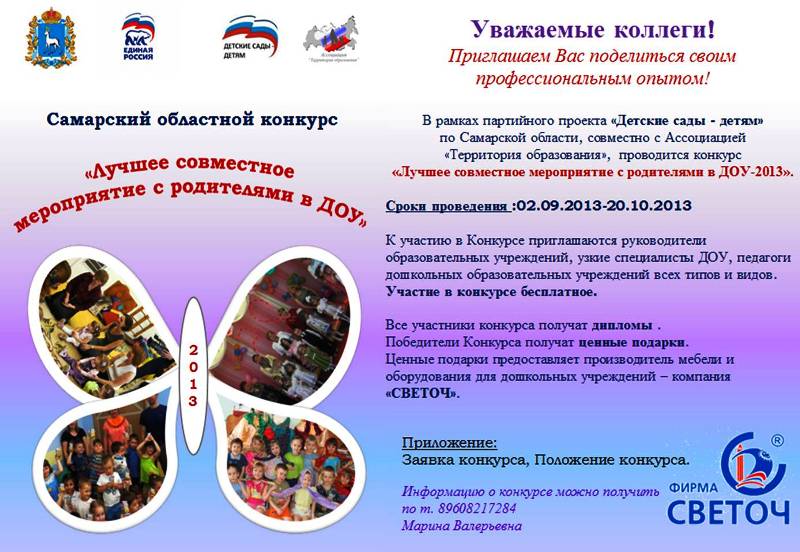 В Самаре объявлен областной конкурс для детских садов «Лучшее совместное мероприятие с родителями в ДОУ-2013». Положение конкурса разработано и утверждено экспертным советом Ассоциации «Территория образования» в рамках работы партийного проекта «Детские сады- детям». Расскажите о конкурсе заведующим садов, в которые ходят ваши дети, проявите инициативу - речь идет о мероприятиях, которые проводились совместно с вами, при активном участии родителей.   Официальные сайты Конкурса: http://www/detisamara.ru http://www.educat.samregion.ru/ http://samara.er.ru/projects/2012/2/14/detskie-sady-detyam/   Цели и задачи конкурса: - Развитие творческого потенциала педагогов ДОУ. - Мотивация профессионального развития педагогов. - Предоставление участникам возможности соревноваться в масштабе, выходящем за рамки учреждения  в рамках открытого творческого Конкурса. - Распространение передового педагогического опыта.   Конкурс проходит с 02.09.2013 г. по 20.10.2013 года. Работы участников Конкурса принимаются с 02.09.2013 года по 15.10.2013 года. Работа Жюри проводится с 16.10.2013 г. по 20.10.2013 г. Оглашение итогов Конкурса и награждение победителей состоится 21.10.2013   Конкурс проводится по следующим номинациям: - «Лучшее спортивное развлечение» - «Лучший  утренник»   К участию в Конкурсе приглашаются руководители образовательных учреждений, узкие специалисты ДОУ, педагоги дошкольных образовательных учреждений всех типов и видов. Тема конкурсных работ: любое мероприятия, касающееся воспитательно-образовательной деятельности дошкольного образовательного учреждения, проведенное совместно с родителями воспитанников ДОУ. На конкурс представляется конкурсная работа (для сравнения - объем в формате  Word 3-7 страниц) с подробным описанием проведенного мероприятия. Победители Конкурса получают почетные дипломы и ценные подарки. Ценные подарки предоставляет производитель мебели и оборудования для дошкольных учреждений – компания «СВЕТОЧ».