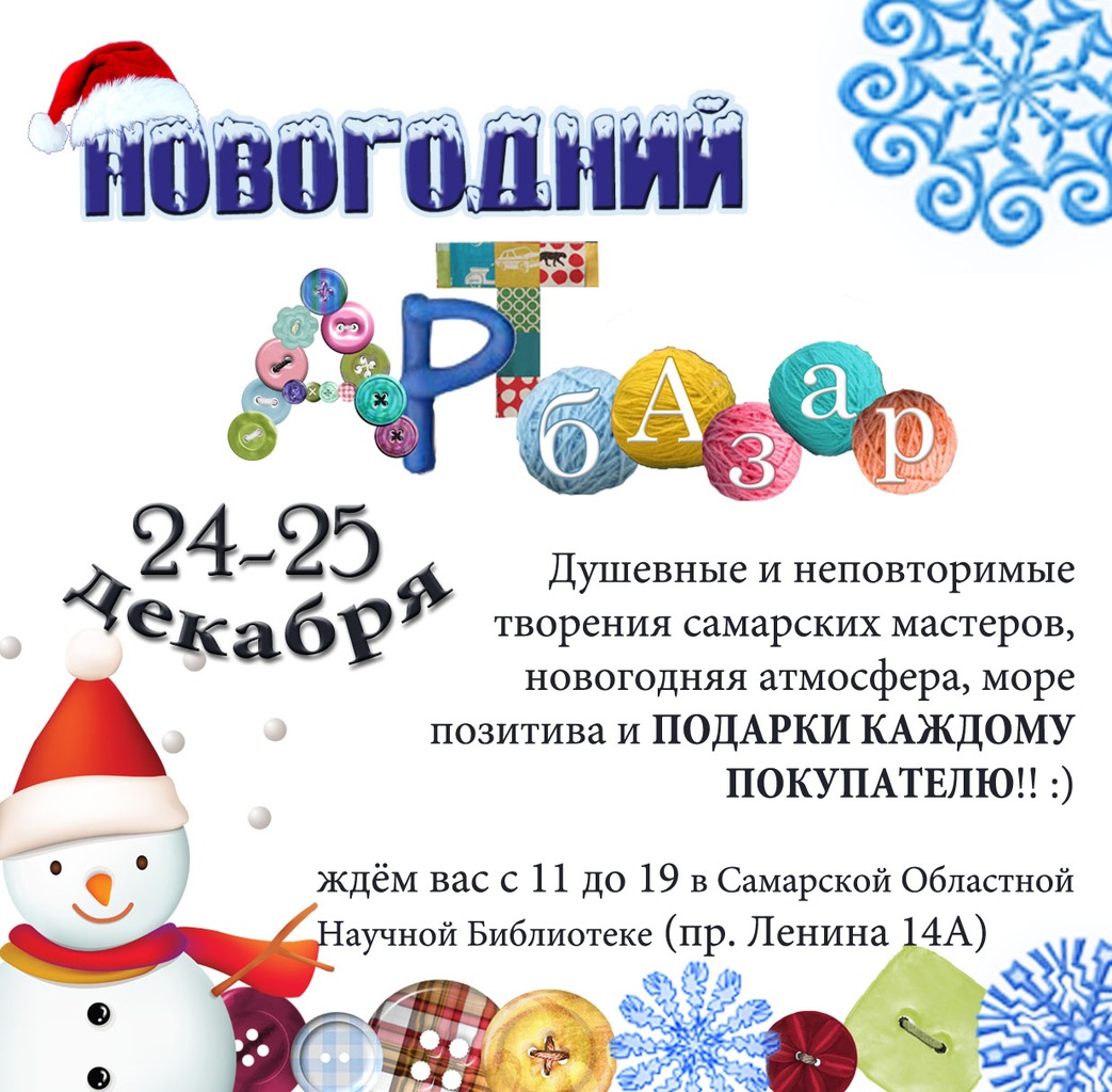 24-25 декабря в Самарской областной библиотеке пройдет Новогодний АРТ-БАЗАР. Прекрасная возможность не только порадовать себя любимого, но и подобрать подарки на Новый год друзьям, родственникам и коллегам.