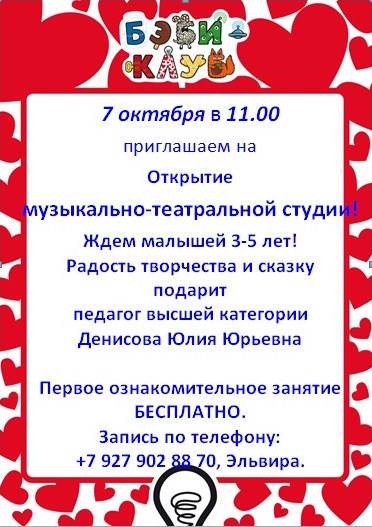 Бэби-клуб на Лесной 7 октября в 11.00 приглашает малышей 3-5 лет на бесплатное ознакомительное занятие музыкально-театральной студии! Занятия будет проводить педагог высшей категории Денисова Юлия Юрьевна.