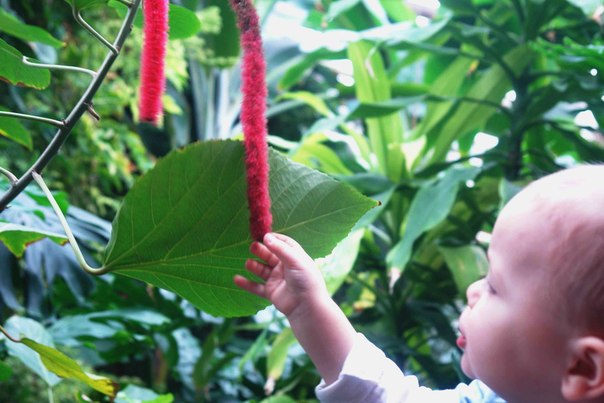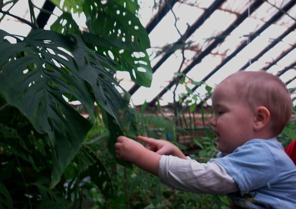 Хорошо, что все листики, веточки можно трогать -- главное следить, чтобы ребенок их не срывал. Ярослав смог достаточно детально изучить все интересующие его экспонаты – какие листики гладкие, шершавые или же с колючками, с иголками и даже листики с дырками.