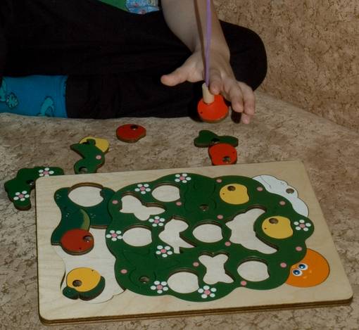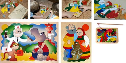 Это не совсем пазлы в обычном нашем понимании, т.к. они объемные. Тематика пазлов в основном по русским народным сказкам. Фигурки выполнены качественно, без заноз и заусенцев в обработке древесины. Зазор между детальками маленький, качество подгона деталей друг к другу хорошее. Эти игрушки подойдут для ребенка старше 4-х лет, так как требуют развитых навыков мелкой моторки. Стоит отметить, что каждая деталь пазла может самостоятельно использоваться в сюжетных играх, являясь полноценной моделью зверька или человечка.