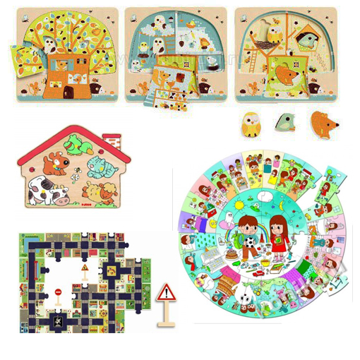 Пазлы и головоломки этих фирм похожи друг на друга. Производятся они в Китае. В основном это рамки-вкладыши на разные тематики – игрушки, животные, герои мультфильмов. Сложных многодетальных пазлов у этих фирм нет. Качество исполнения не на высоте, но в целом – на твёрдую 4 из 5 баллов. На деталях могут встречаться заусенцы. В играх типа одень девочку или мальчика, где кофточки и штанишки могут меняться местами, может случиться, что в некоторые гнезда они подходят хорошо, а в некоторые нет. Есть игры-головоломки, где вначале представлена картинка с 4-5 разными фигурами, нарисованными вместе, а дальше нужно в ряд разложить по отдельности всё то, что нарисовано вместе. Иногда квадраты с рисунками, которые раскладывает ребенок в ряд, не одинаковые, поэтому ровно их разложить не получается – что-то лезет, а что-то нет. Поэтому рекомендуем при покупке более внимательно проверять качество изготовления элементов. Что-то более утонченного и красивого от этих фирм ожидать, как кажется, не стоит – но всё же они занимают уверенную и твердую позицию на рынке деревянных пазлов в России.