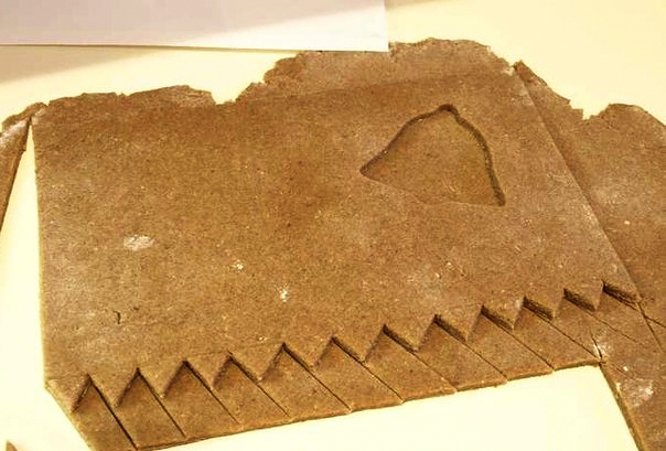 А сами тем временем проявляем способности архитектора -- рисуем на картонках и вырезаем будущие части дома: один образец для двух стен, один для двух частей крыши, один образец для двух торцов и два для трубы (но можно обойтись и без нее). Раскатываем тесто толщиной 1-2см, вырезаем необходимые части ножом по картонным трафаретам. Подключаем к работе свое воображение — вырезаем окошки либо ножом, либо формочками для печений. Можно сделать края крыши ажурными.