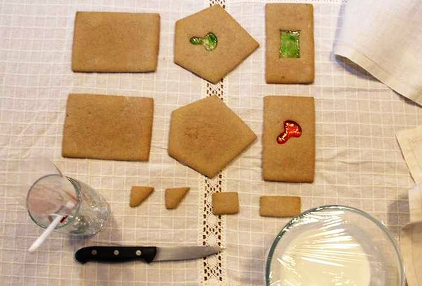 Выкладываем части дома на застеленный пергаментом противень и отправляем в духовку разогретую до 1700-1800 выпекаться в течении 6 минут. Беремся за карамельки — измельчаем их скалкой или молотком. Когда наши пряничные детали уже провели 6 минут в духовке, достаем противень, засыпаем в отверстия окошек карамельные крошки на одном уровне с пластом пряника и выпекаем их еще 6 минут. Готовность проверяем так: надавливаем слегка на серединку выпечки — она должена пружинить. Вынимаем, оставляем на противне на 5 минут, затем перемещаем на решетку до полного остывания.