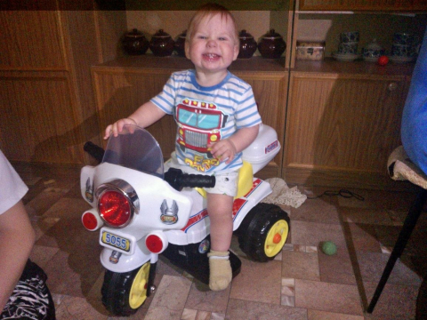 Годовалый Коля радуется своему первому мотоциклу и хочет на него крутой номер
