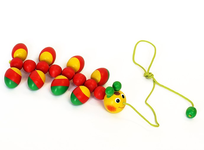 1. Игрушка-шнуровка, материал для сюжетных игр. Бусы окрашены в приятные цвета и изготовлены таким образом чтобы форма каждой бусины была понятна маленькому ребенку и могла быть легко названа: яйцо, грибок, матрешка, чугунок, желудь, снеговик, бочонок, гирька, колесо. Ребенок на ощупь знакомится с величиной, формой, материалом фигурок, и при этом развивает внимание, тактильную память и мелкую моторику. 9 деталей размером около 5 см.