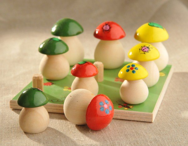 2. Игрушка на развитие моторики, на счет, на классификацию по размеру и цвету. Сами по себе грибы могут использоваться в сюжетных играх, где варят и готовят, или в магазин. Грибы классифицируются по двум признакам - по размеру и по цвету.