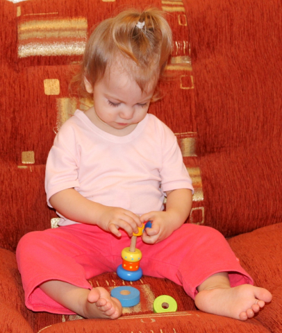 Мариночка очень любит играть с пирамидкой. Она может долго сидеть собирать её и разбирать.