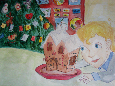 Этот рисунок мы рисовали вместе с сыном. Наше самое любимое сладкое лакомство - пряничный домик. С ним у нас связана небольшая семейная традиция: день рождения у сына в декабре, незадолго до новогодних праздников, и вместо традиционного торта мы уже несколько лет заказываем к праздничному столу пряничный домик. Сын - в восторге, ведь это и сладость, и игрушка, и какая-то тайна (а вдруг в домике кто-то живет?)))