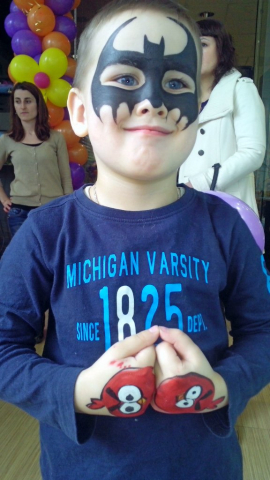 Тёма всегда пользуется возможностью побыть супер-героем,дома он ходит исключительно в костюме человека-паука)) здесь он в "маске" Бетмена и изображает супер-геройское выражение лица)
