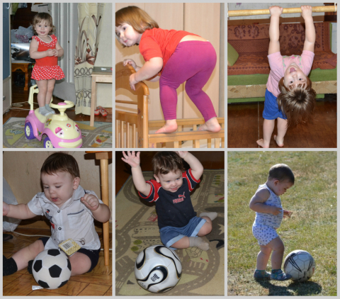 Старшая с детства увлеклась домашней акробатикой, пока она маленькая для профессионального спорта, но то что первое куда мы её отдадим будет спортивная гимнастика это 100%, а младший с детства влюбился в мяч при этом не в баскетбольный (папа наш сильно увлекается этим видом спорта) а в футбольный...так что теперь еще и футболист подрастает.