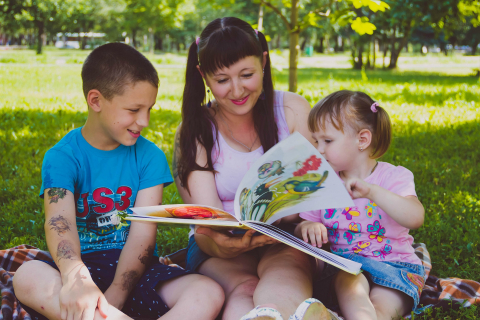Любим с детками читать, особенно здорово читать и рассматривать картинки на зеленой травке в солнечную погоду. На фото еще сыночек Гриша 9 лет.
