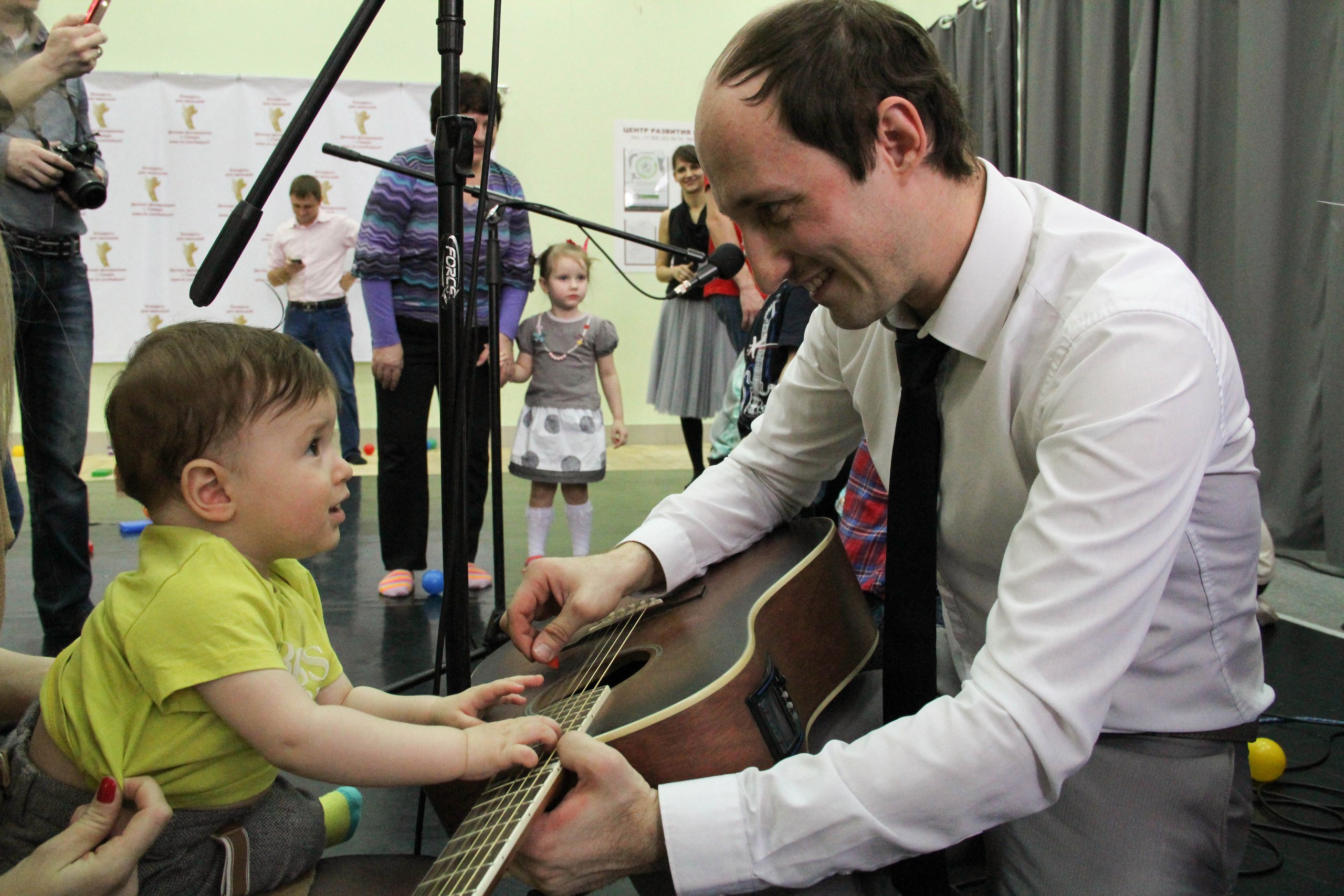 В зале малыши с родителями располагаются на ковриках и подушках. Создано игровое пространство, во время концерта можно свободно бегать и играть.
