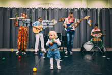 Флейта относится к инструментам, обладающим высокой вибрацией, и ее используют даже для терапии музыкой. Гитара позволяет сделать этот квартет более красочным и «живым». А настоящая ударная установка бережно и ритмично «зажигает» малышей и родителей.