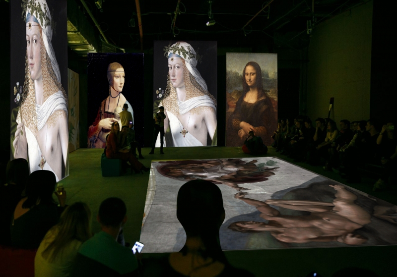 Работы великих художников оживут на огромных экранах: Рафаэль, Микеланджело, Леонардо да Винчи, Ботиччели, Беллини, Тициан, Венето, Джорджоне, Тинторетто и Веронезе. Выставка будет представлена в совершенно новом формате: зрители будут окружены 3-7 метровыми полотнами эпохи Возрождения, двигающимися и оживающими прямо на глазах. Сотни шедевров будут показаны на больших экранах в сопровождении произведений классической музыки. Яркие изображения, расположенные на стенах, перенесут зрителей в творческую реку художников Эпохи Ренессанса, привлекая внимание зрителей к важнейшим деталям картин, колориту и живописной технике.