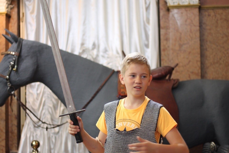 После экскурсии по выставке у юных посетителей есть возможность узнать больше об оружии и военном искусстве того времени, а также примерить кольчугу и сделать в ней фото на память.