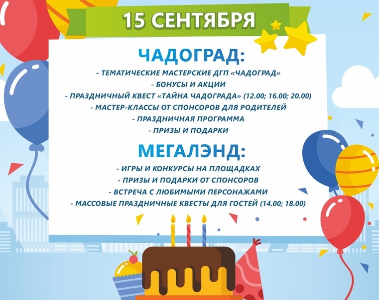 Чадоград и Мегалэнд приглашают детей всех возрастов и их родителей на свой первый день рождения.