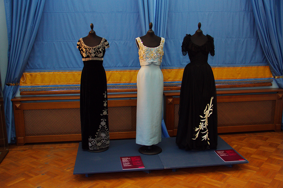 На выставке представлены коллекции историка моды Александра Васильева «Кино и мода». Это более 40 вечерних и сценических нарядов, раритетные дамские аксессуары, принадлежащие звездам советского кино и сцены 1930-1990-х.