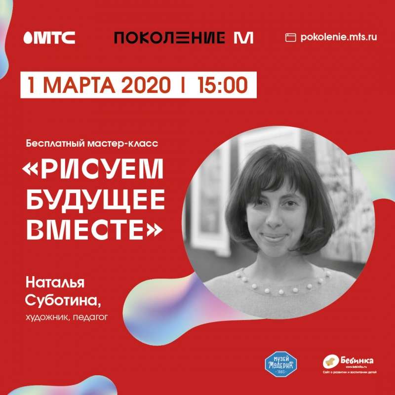 Благотворительный проект компании МТС «Поколение М» и Музей Модерна приглашают детей и подростков от 11 до 18 лет на мастер-класс «Рисуем будущее вместе» от художника и педагога Натальи Суботиной.
