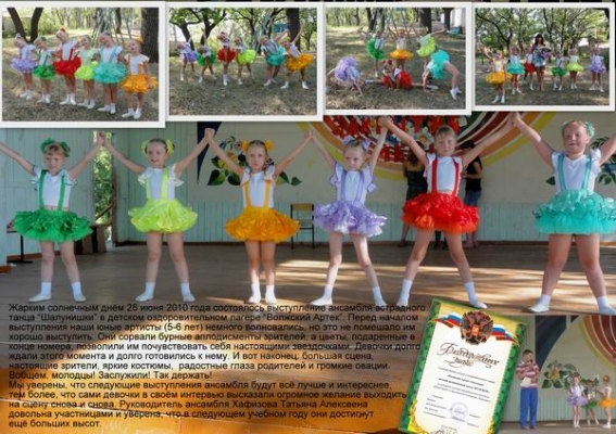 Описание: В процессе занятий развивается координация движений, чувство ритма, пластичность, гибкость, вырабатывается правильная осанка, хорошая растяжка. Наиболее способные дети отбираются в ансамбль эстрадного танца «Шалунишки». Периодически проводятся открытые занятия для родителей и гостей, а также выездные выступления.