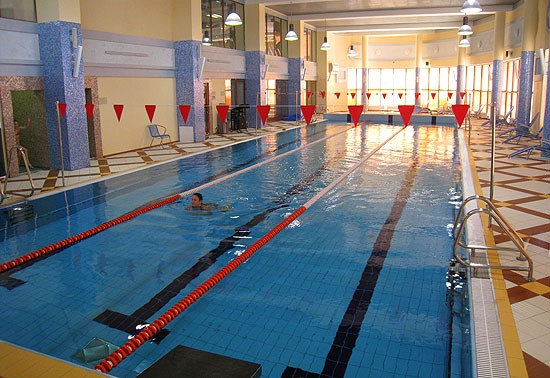 Спортивный бассейн — это бассейн длиной 25, шириной 8 метров, разделенный на 3 дорожки шириной 2,6 метров каждая, с постепенно меняющейся глубиною до 3 метров. Он предназначен для спортивного и подводного плавания, оздоровительных процедур, занятий по аквааэробике, аквафитнеса, всевозможных силовых и интервальных упражнений в воде, реабилитационных программ и др.