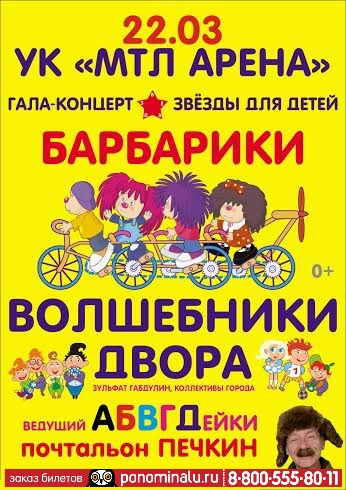 Свои хиты исполнят любимые детьми звезды «Детского радио» - «Барбарики» и группа «Волшебники Двора», а также талантливый исполнитель Зульфат Габдулин. А в перерывах между музыкальными номерами, вас ждут ведущие, которых дети раньше видели по телевизору, в том числе там будет почтальон Печкин из программы АБВГДейка.