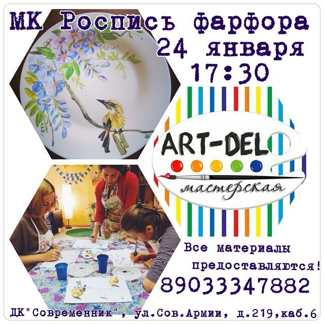 Мастерская ART-DELO приглашает взрослых и детей от 6 лет на мастер-класс по росписи фарфора. На нем вы научитесь рисовать птиц поэтапно, шаг за шагом: сначала на бумаге, потом на фарфоре специальными красками для керамики. Вы получите огромное удовольствие от процесса работы и море позитива. Каждый уйдет со своей тарелочкой с птичкой.