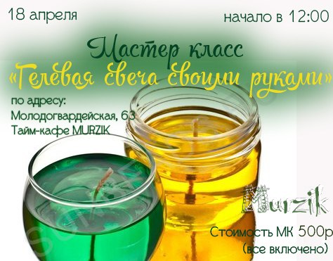 Творческая мастерская «Души не чаю» приглашает на мастер-класс «Создание гелевой свечи» в тайм-кафе «Мурзик» взрослых и детей от 4-х лет.