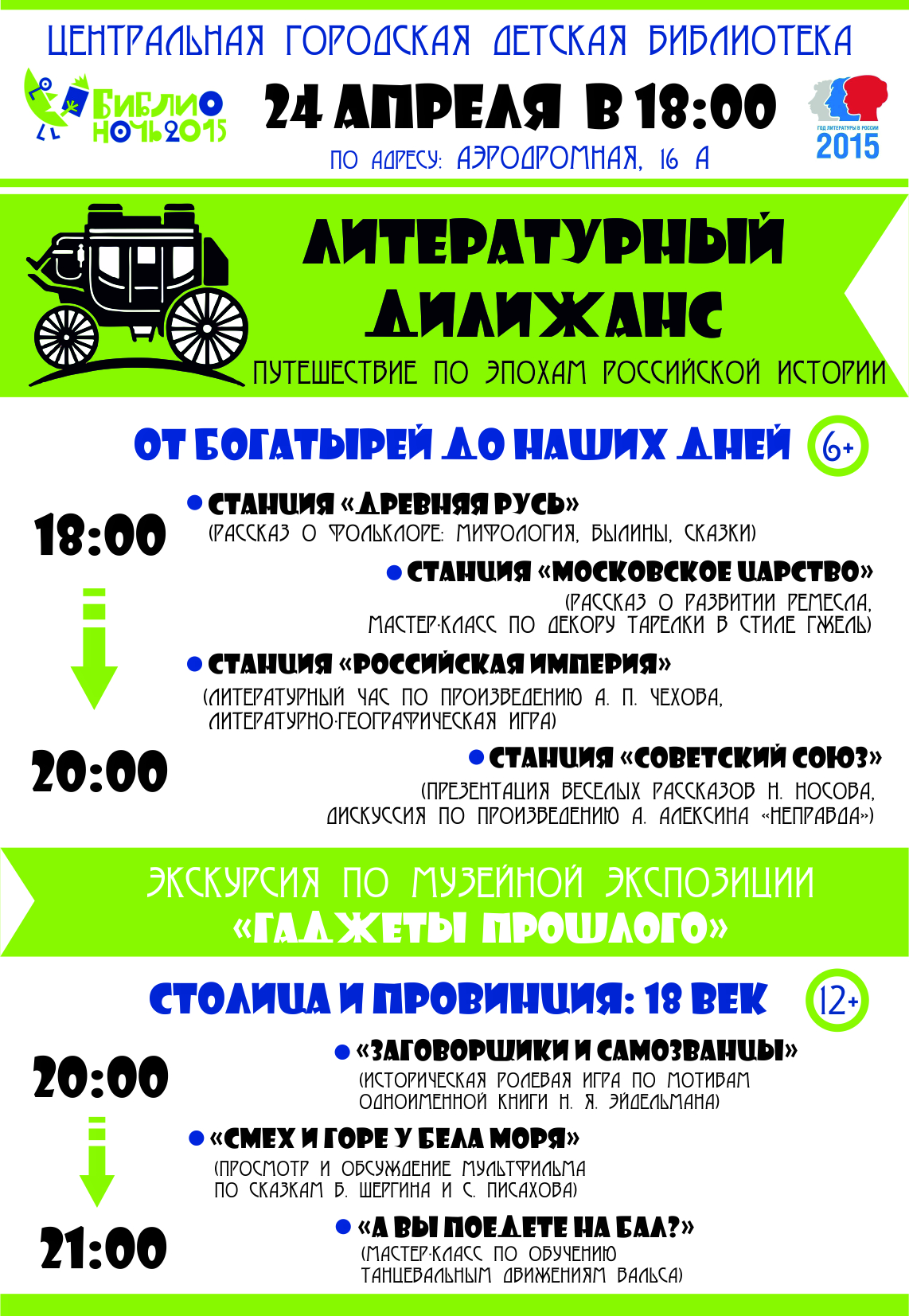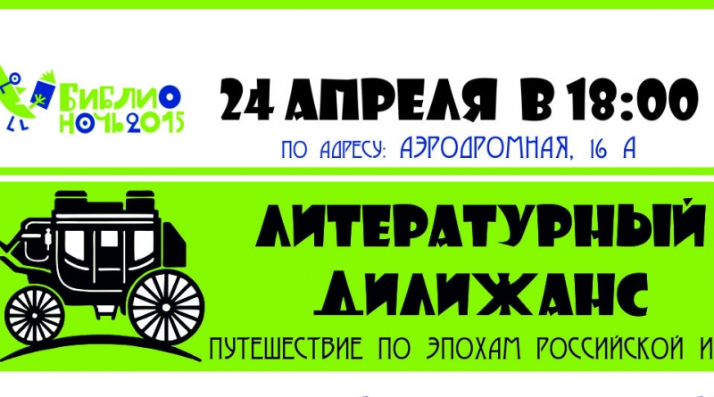 Центральная городская детская библиотека приглашает детей от 6 лет совершить путешествие по эпохам российской истории «Литературный дилижанс». Программа проходит в рамках ежегодной Всероссийской акции в поддержку чтения — «Библионочь 2015».