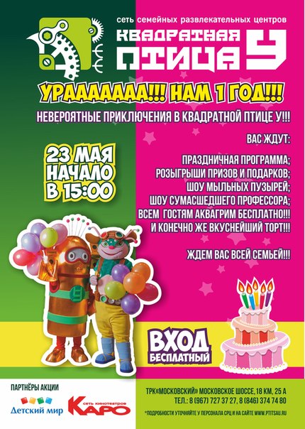 Семейный развлекательный центр «Квадратная птица У» приглашает взрослых и детей всех возрастов на праздничную программу в честь празднования своего первого дня рождения.