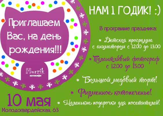 Весь день для посетителей — фирменное котопеченье, маленькие подарочки, а так же большой медовый торт.