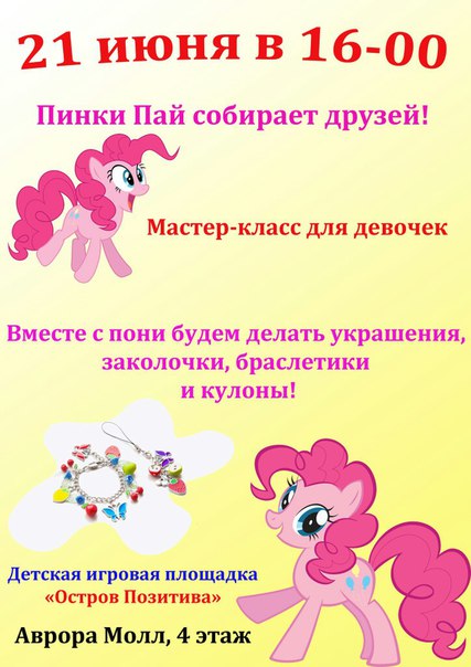 В программе праздника мастер-класс по изготовлению заколочек, браслетов, резиночек и кулончиков! Вместе с Пинки Пай вы изготовите себе яркие украшения, которые заберете с собой.