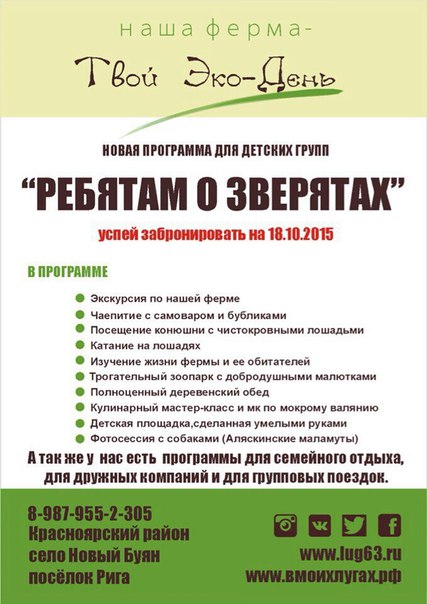 Вас ожидает не только экскурсия по ферме и фермерский обед из натуральных продуктов, еще вы узнаете много интересного о жизни обитателей (Как пасутся лошади? Как доить корову? Что любят бараны на десерт, и многое другое). Попробуем растопить настоящий самовар на углях, узнаем как запрягать лошадь, как работает керосиновая лампа, поиграем в русско-народные игры, немного передохнем на детской площадке и сделаем кое что вкусненькое на кулинарном мастер-классе, потом покатаемся на лошадях, потискаем огромных и добрых маламутов и, напившись чая с травами и бубликами, отправимся домой делиться эмоциями и фотоотчетом.