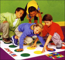 «Твистер» — увлекаетльная игра, которая может буквально «завязать вас в узел»! Разверните коврик, положите его на пол кружками вверх, выберете судью и начинайте играть. Суть игры в следующем: судья крутит рулетку и обьявляет, какую ногу или руку должны передвигать игроки и цвет, на который указывает стрелка рулетки. Если игрок потерял равновесие, коснулся локтем или коленом коврика или упал — он выбывает из игры. Дети изучат тонкости игры, разучат увлекательную гимнастику для гибкости, поиграют в различные игры на равновесие и сделают небольшие аппликации с цветными кружками.
