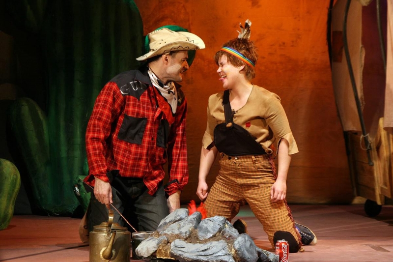 Несмотря на то, что эта постановка адресована детям, спектакль понравится и маленьким, и взрослым зрителям – ведь в нем отлично сочетается увлекательный сюжет, искрометный юмор, трюки и своя мораль. Спектакль «Вождь краснокожих» поставлен по мотивам одноименного рассказа знаменитого американского писателя второй половины XIX века О. Генри. Сюжет спектакля рассказывает историю о двух авантюристах с Дикого Запада, которые похитили мальчишку, чтобы получить у его богатого папаши выкуп. Но малыш Джонни — настоящий «бесенок» — устраивает своим захватчикам такую жизнь, от которой у них кровь леденеет в жилах. Он провозглашает себя «вождем краснокожих» и втягивает в «мучительную игру» своих похитителей. Вскоре незадачливые разбойники начинают понимать, что они не в состоянии справиться с буйной детской фантазией, и мечтают избавиться от Джонни любым путем. Под музыку кантри разворачивается смешная история, в которой есть все, что нравится детям — индейцы, бандиты, драки и розыгрыши.