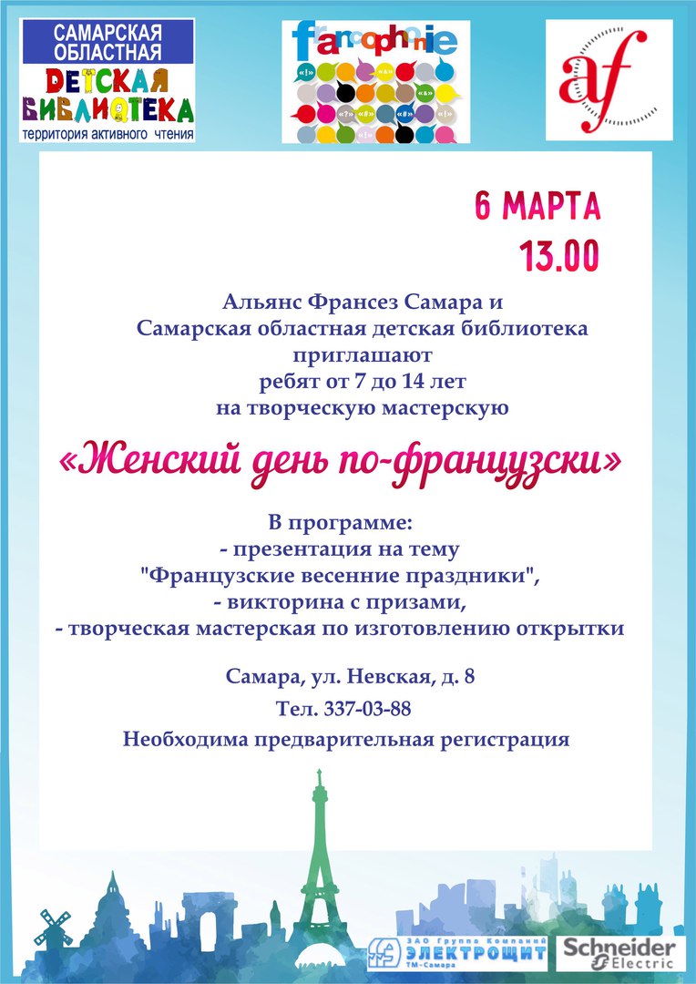 Самарская областная детская библиотека приглашает на женский день по-французски детей от 7 до 14 лет в рамках международного фестиваля «Франкофония-2016». Проводится совместно с Альянс Франсез Самара.