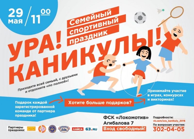 На стадионе «Локомотив» состоится спортивный праздник «Ура! Каникулы!». К участию приглашаются семейные команды из 3 человек: 2 взрослых от 18 лет и ребенок до 14 лет.
