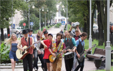 Около семидесяти музыкантов, играющих на разных инструментах, вместе исполнят две популярные рок-композиции.