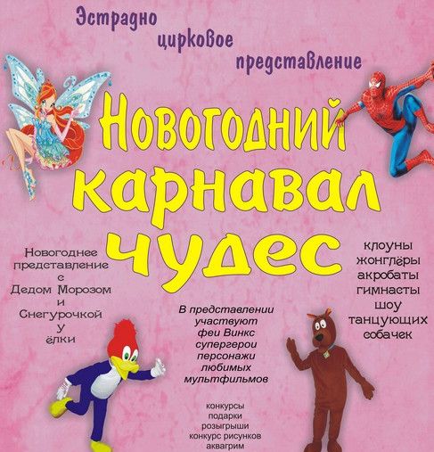 «Карнавал чудес» Что: новогодняя елка Когда: 27, 28, 29 декабря. 2, 3, 4 января в 12:30 Возраст: от 2-х лет и старше Стоимость: 100 руб. (до 3-х лет), 200 руб.(3-6 лет), 200-500 руб. (старше 6 лет) Контакты: 272-68-82 Уникальная новогодняя  программа с участием Деда Мороза, Снегурочки, волшебниц Винкс, Супермена, клоунов, ростовых кукол. Вас ждут уникальные цирковые номера, шоу танцующих собачек, весёлые конкурсы и игры, весёлая интерактивная программа у ёлки, конкурс на лучший новогодний костюм, розыгрыш призов, аквагрим. Все ребята смогут поучаствовать в нашем представлении, попробовать свои силы на сцене, поиграть с героями представления и получить подарки от наших артистов, а также сфотографироваться с участниками спектакля. Перед началом представления конкурс новогодних рисунков.       Филармония  (ул. Фрунзе, 141)