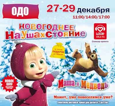 «Новогодние приключения Маши и Медведя» Что: новогодняя елка Когда: 27-29 декабря в 11:00, 14:00 и 17:00 Возраст: 2-7 лет Стоимость: 200-700 руб. Сладкий подарок (по желанию) - 300 руб. Детям до 2-х лет бесплатно. Контакты: 270-36-98, 373-68-15, 248-43-43, 247-73-73 Московский Театр ростовых кукол "Сказки детства" представляет Новогодние приключения Маши и Медведя. Главные герои новогоднего спектакля - любопытная девочка Маша и добряк Медведь С полюбившимися персонажами происходят настоящие новогодние чудеса! После новогодней сказки детей ждет увлекательная программа вокруг ёлки!