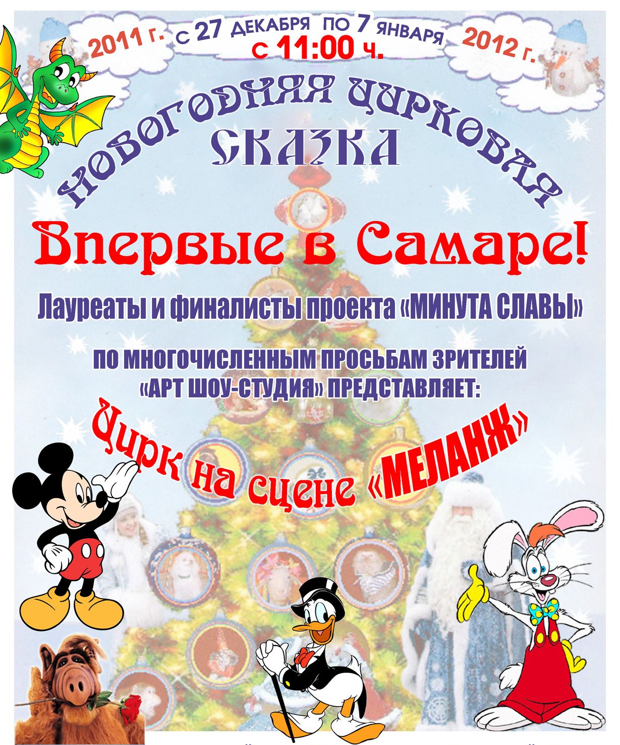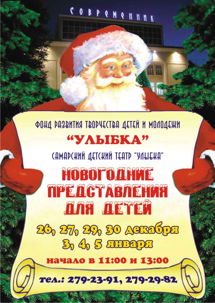 «Старая сказка на новый лад или Дед Мороз против» Что: концерт-шоу Когда: 3-5 января в 11:00 и 13:00 Возраст: 8-11 лет Стоимость: 150 руб. Контакты: 279-23-91, 279-29-82 Яркая, красочная новогодняя шоу-программа, где много музыки и танцев в исполнении самарского детского театра «Улыбка».