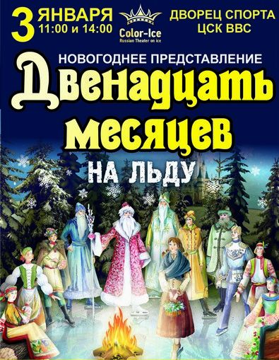 "Двенадцать месяцев на льду" Что: спектакль на льду Когда: 3 января в 11:00 и 14:00 Стоимость:200-800 руб. Детям до 2-х лет бесплатно. Возраст: с 4-х лет Контакты: 270-36-98, 373-68-15, 248-43-43, 247-73-73 «Двенадцать месяцев» - одноименный новогодний спектакль на льду, созданный по мотивам известной сказки С.Я. Маршака, который позволяет нам как зрителям погрузиться в волшебную атмосферу новогодней ночи, и познакомиться со всеми чудесами каждого времени года. Мастерство артистов, оригинальная постановка, яркие костюмы и декорации произведут незабываемое впечатление, как на детей, так и на их родителей.