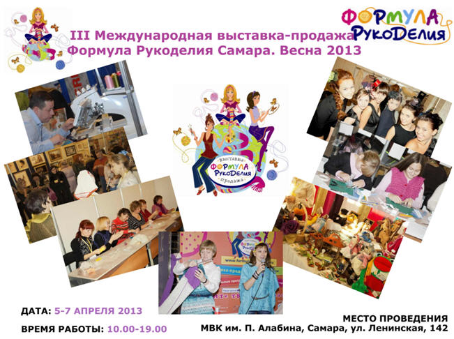 5-7 апреля в МВК им. П. Алабина пройдет выставка "Формула рукоделия". Это масштабный проект, посвященный всем видам современного рукоделия и ручной работы, различным видам хобби и созидательного досуга. Есть повод придти на выставку с детьми - на специальной детской творческой площадке все дни будут идти бесплатные мастер-классы для юных талантов. А на центральной сцене будет проходить развлекательная программа, в том числе шоу сумасшедшего профессора Николя и его интерактивные опыты. Подробную  программу в указанием всех детских мероприятий можно скачать на странице выставки Вконтакте. Сайт мероприятия http://www.formula-rukodeliya.ru/exhibition/samara/ Формула рукоделия Вконтакте http://vk.com/formula_rukodeliya_samara